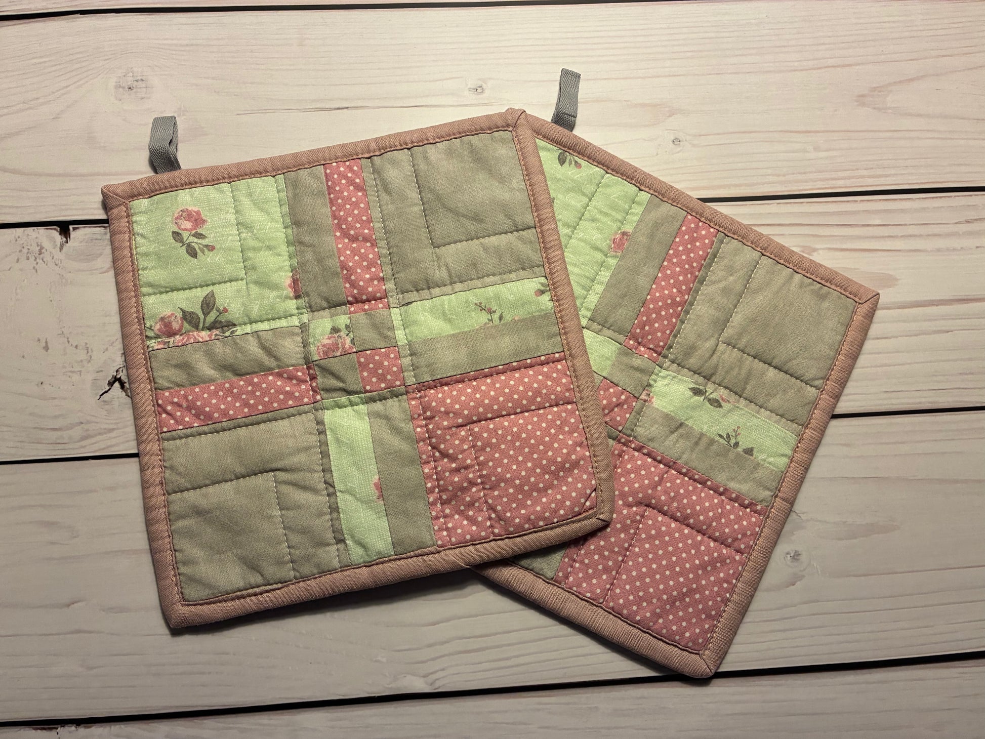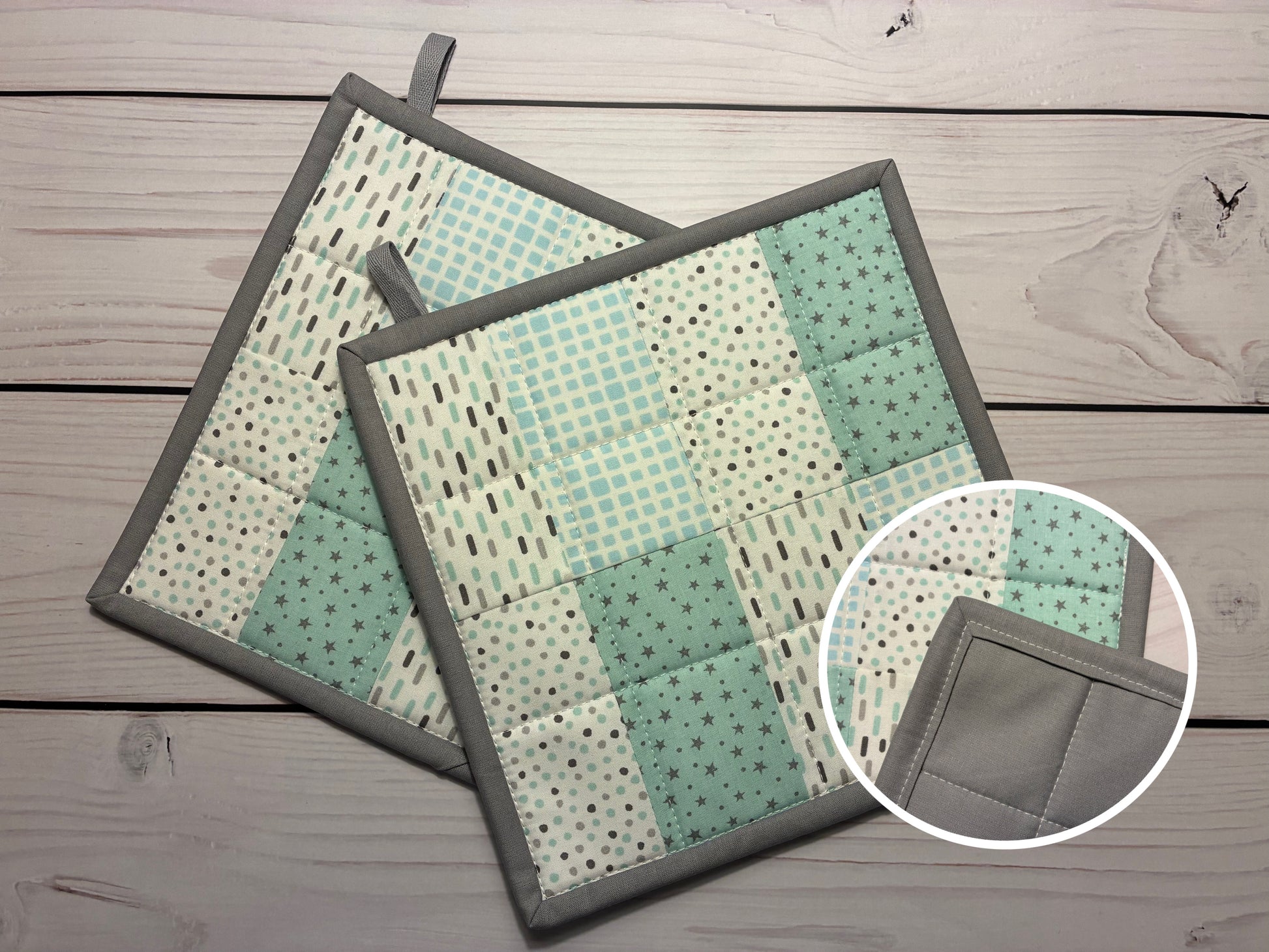 Die Vorderseite ist in verschiedenen Stoffen und Patchworkmustern gehalten, die Rückseite und das Binding (der Rand) aus farblich passendem Stoff. Wattiert sind die Topflappen mit zwei Lagen hitzebeständigem Volumenvlies.